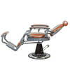 В дизайне кресла присутствует много металлических деталей и фурнитуры под медь или шагрень. Подлокотники и подставка на подножках обиты экокожей, что придает креслу большей солидности, а клиенту максимального комфорта.