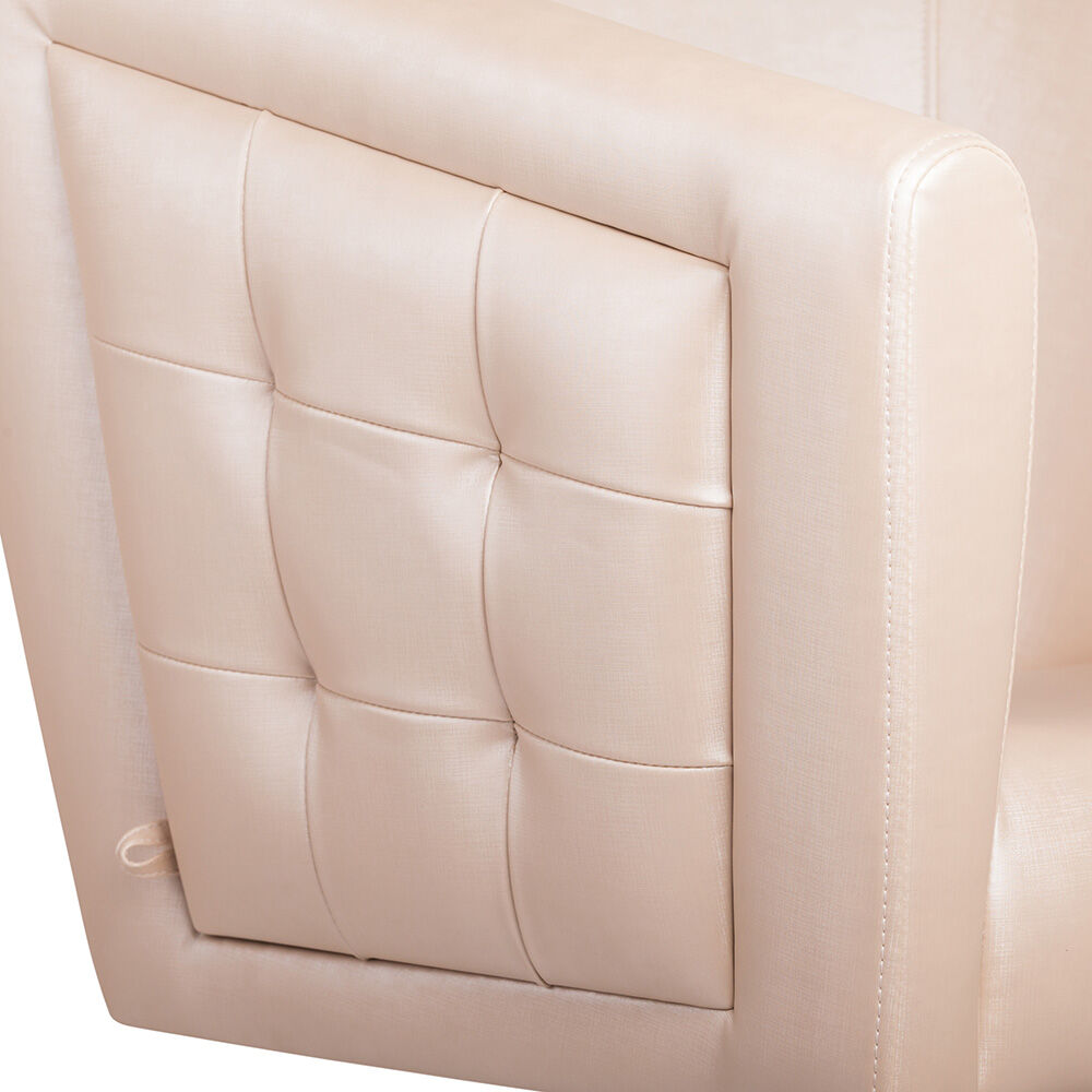 Парикмахерское кресло Гармония с удобной спинкой и мягкими подлокотниками. С внешней стороны подлокотники кресла украшены вставками с декоративным геометрическим рисунком в виде квадратов с утяжками. По желанию возможно изготовить вставки, отличающиеся по цвету от самого кресла.