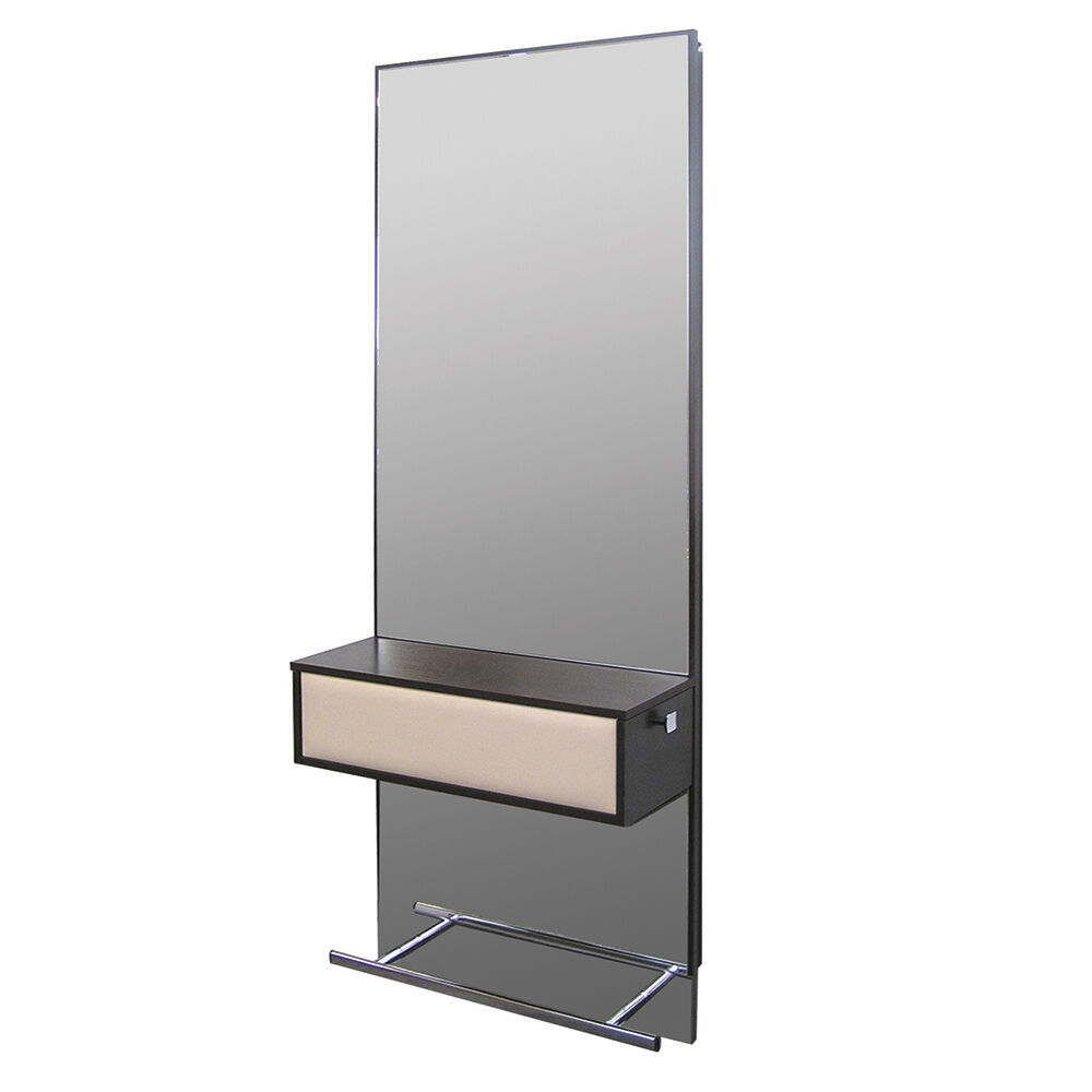 Туалет парикмахерский односторонний настенный (навесной). Столешница выполнена с двумя выдвижными ящиками (в левую и в правую стороны). Лицевая сторона столешницы имеет декоративную вставку из искусственной кожи. Над и под столешницей установлены зеркала.