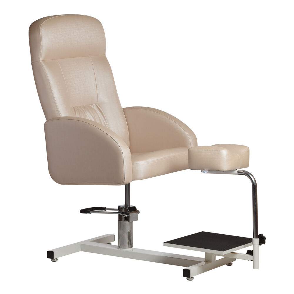Кресло для педикюра укомплектовано мягкими подлокотниками и регулируемой подножкой для ног.